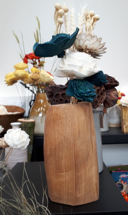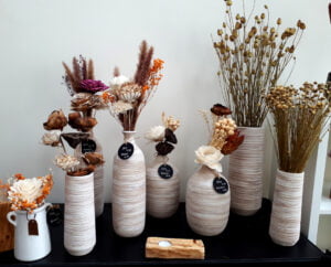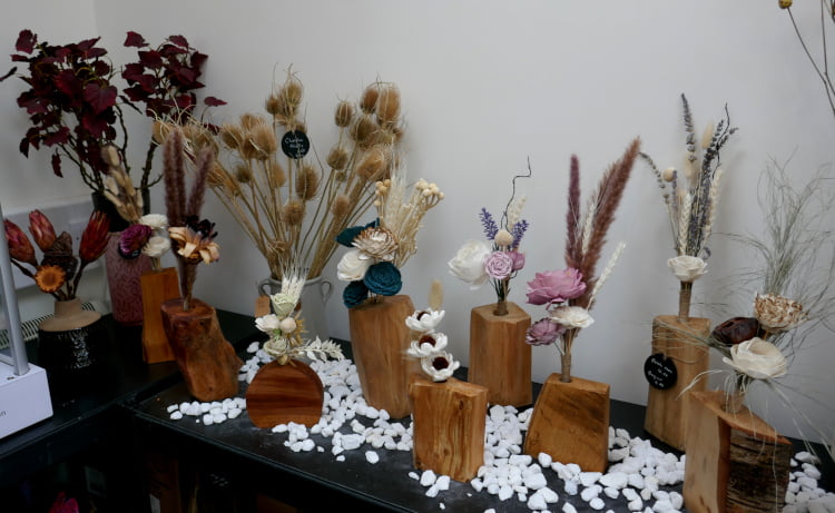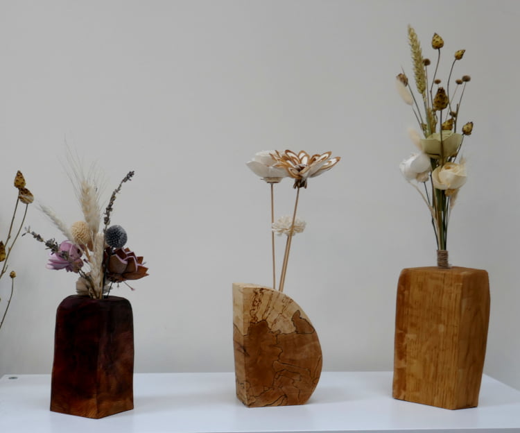The first Sunday of the NiddArt Trail had 20 venues open of 28 but the King Street Workshops were quiet due to holidays, and possibly the Artisan Market. Gill Gray was busy making more flowers and displays to add to her colourful setting in her workshop and explaining her work to visitors. Gill uses local wood from the managed Fishponds woodland in her displays. See her artist page www.niddart.org.uk/gill-gray/