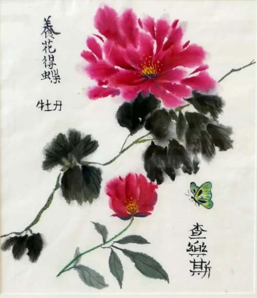 Peony and butterfly – Freestyle painting on unsized xuan paper with brushed chinese watercolours and ink.