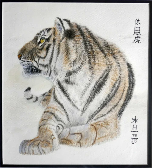 Resting lion – Painted on thin sized chinese paper in chinese watercolour and black ink. A split brush was used for the hair.