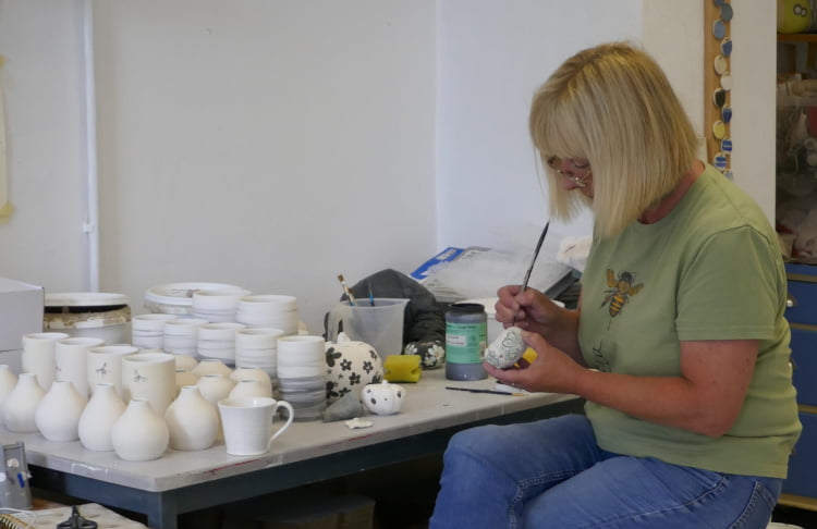 Fiona is working today on her latest ceramics, hand painting butterflies on each piece.