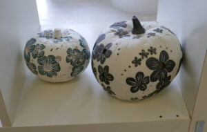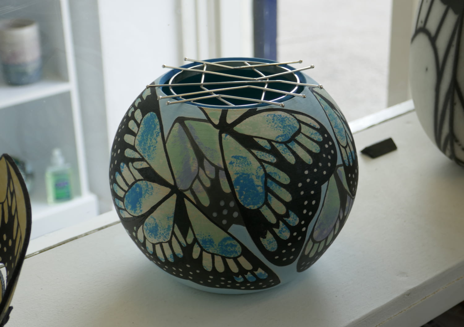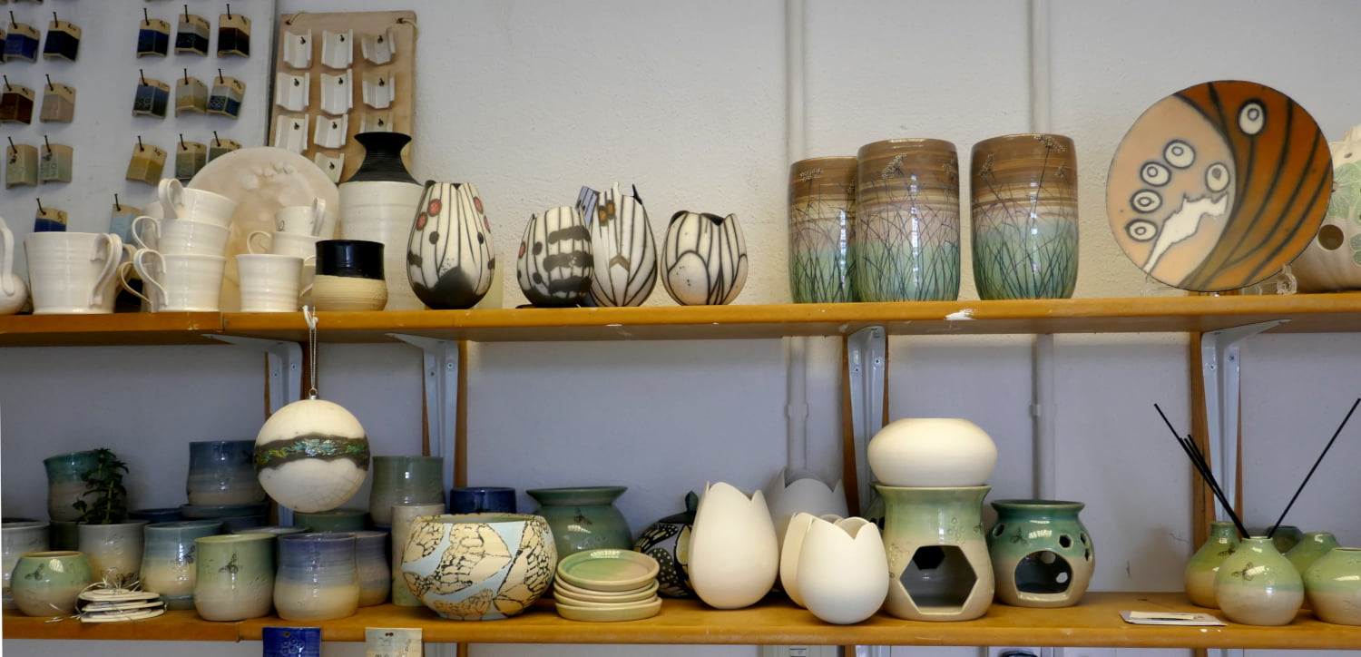 Fiona Mazza works in her studio making, painting and glazing her ranges of ceramics. Her work is on display in the entrance way. She can often be seen working on her commissions for her pieces based on butterfly shapes.