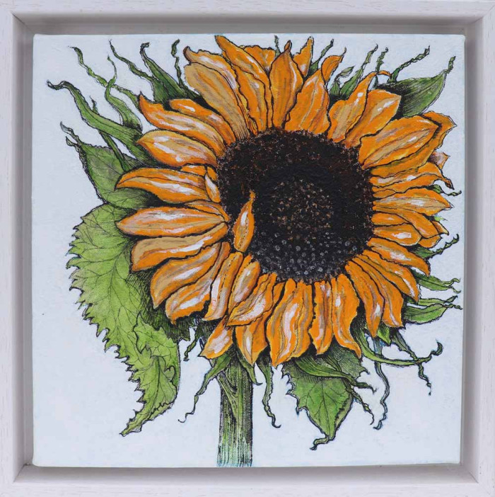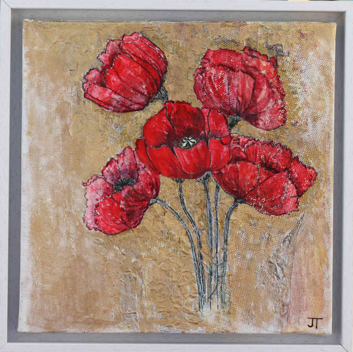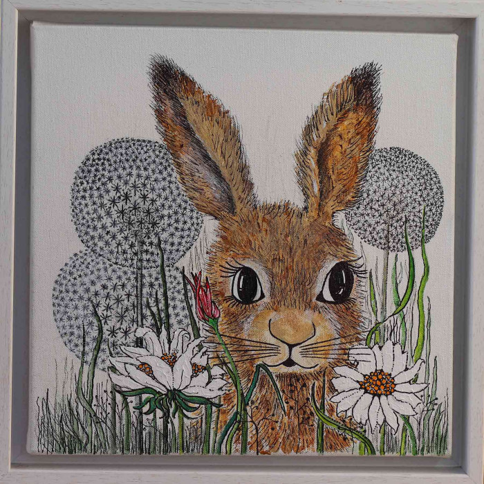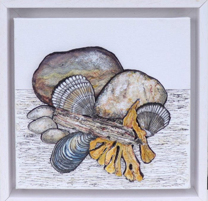 Jean met her husband, Richard at Chesterfield Art School. She showed and sold her work at a Chesterfield Gallery. They lived in Dallowgill for many years, high above the Yorkshire Dales, and had been influenced by the wilderness of the countryside and the amazing coastline. These were the source of her inspiration for paintings and collage of hares, flowers, sea shore, pebbles and shells.