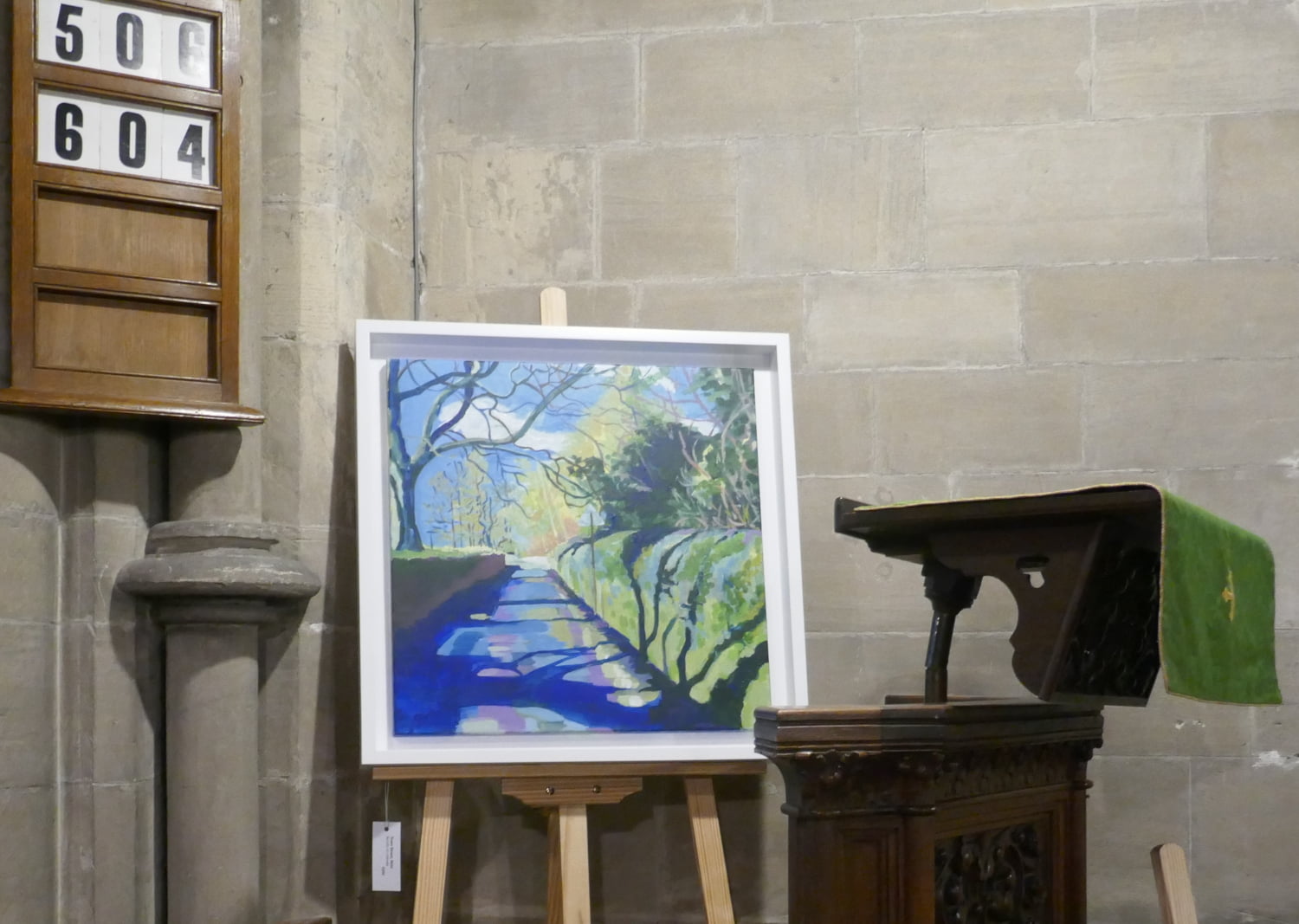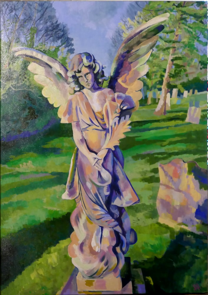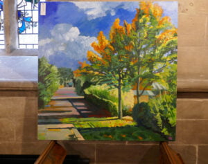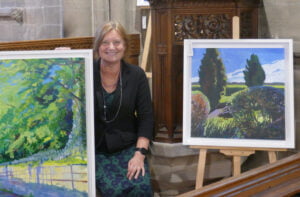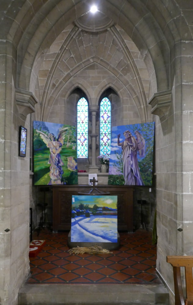 Local artist, Shirley Hudson, has a two day exhibition in Nidd Church as part of the NiddArt Trail on Saturday and Sunday 21st and 22nd August. The works are inspired by the landscape around the village of Nidd which she has studied during daily walks in varying weather and light over the past 18 months. Shirley also exhibited two paintings of angels in a side chapel. The paintings were inspired by local cemetery monuments and were previously exhibited in St Johns Church as part of the Knaresborough Feva festival.