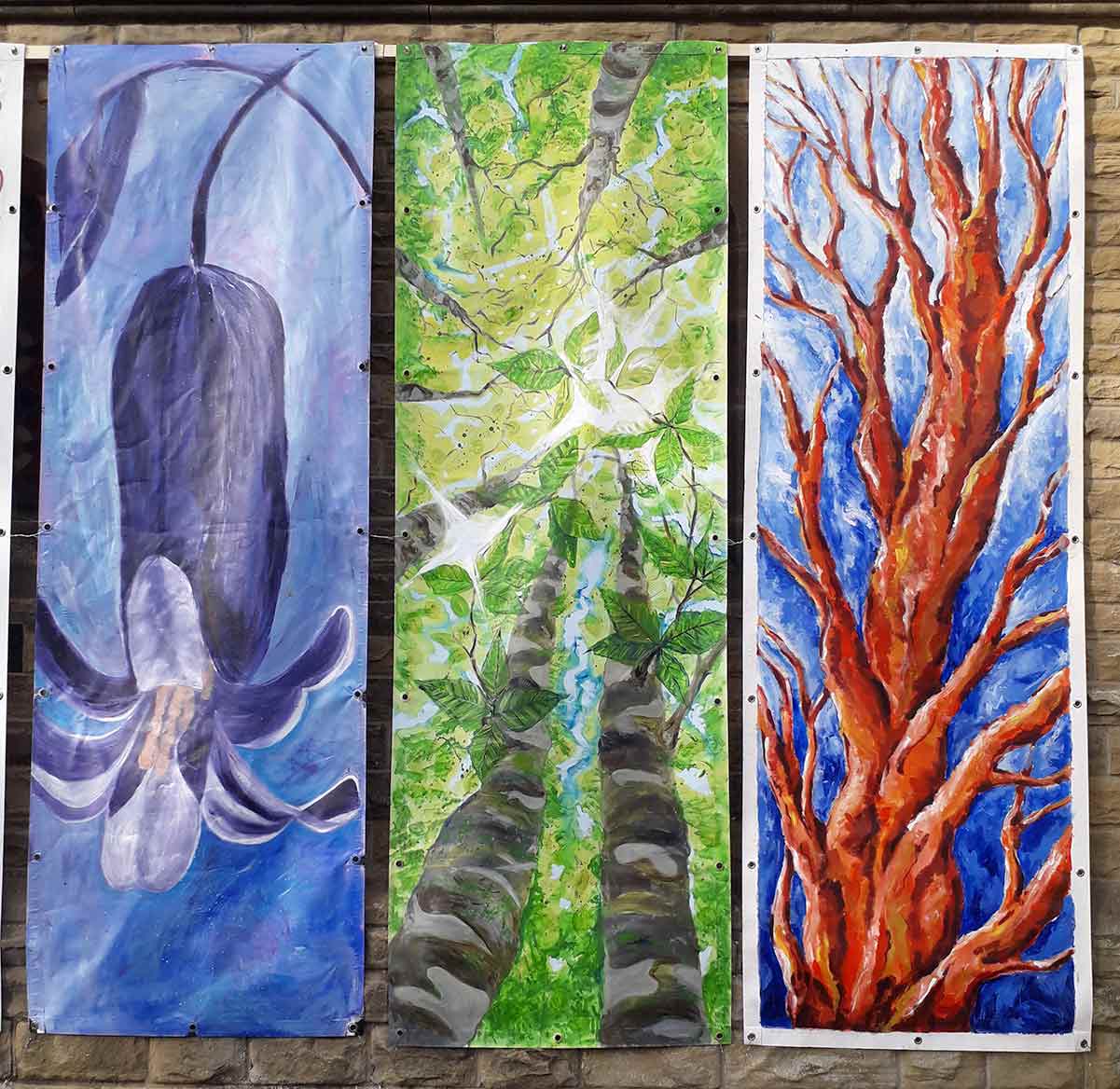 Summerbridge Methodist Church has taken up the ‘Woodlands’ theme in the large striking banners by their artists displayed on the church wall for all to see. Images are also on their NiddArt Trail online web page.